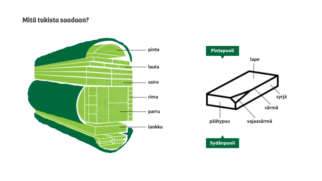 Mukana on niin peruslautaa kuin pienten erien erikoistuotteita. Se, miten puu sahataan ja höylätään, riippuu tukin laadusta ja sahatavaran käyttötarkoituksesta. Sahat ovat pitkälle automatisoituja. Sahatavaraa käytetään muuan muassa rakentamiseen, ja rakennuksissa hiili pysyy pitkään sitoutuneena puuainekseen. Merkittävä osa sahateollisuuden tuotteista menee vientiin.
