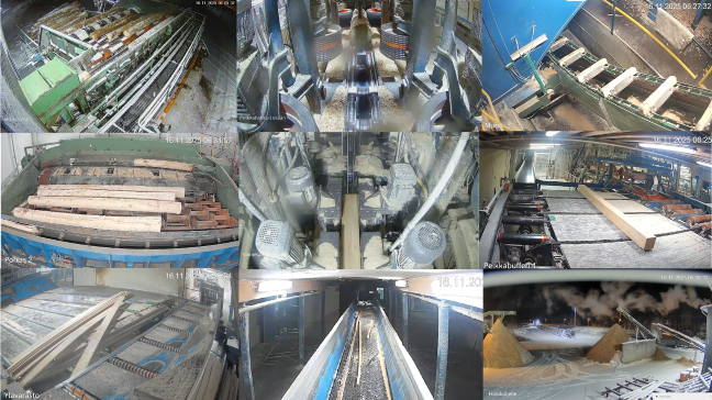 Tämän seinämän korkuisena pinona Suomen sahojen vuosituotanto muodostaisi 5000 kilometriä pitkän muurin! Tutki sahan tuotevalikoimaa ja eri kohdista puuta sahatun tavaran ominaisuuksia. Mihin suuntaan puu vääntyy helpoiten? Huomaatko eroja puun tiheydessä?